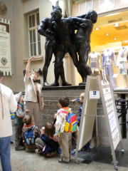Bonn独日協会ボルン会長、メン ヒェ女史などの出迎えをうけ訪問団14名は午後8時ホテルに無事到着しました。翌日はBonnのメンバーとともにライン河Rhein沿いにバスを走らせ ジーべンゲビルゲ(Siebengebirge俗称:七つ山)の山並みを、Godes bergからの眺めを楽しみ、Bonn大学,旧日本大使館など市街を一巡し、ベートーベンハウス、アルトラットハウス広場など中心街を散策。花盛りの菩提 樹の下で“Lindenbaum菩提樹”をみなで合唱したのもいい思い出です。Bonnの息子(ベートウベンBeethoven)のデフオルメ写真スポッ トでBonnの人たちと記念撮影。旧交を温めるには余りにも短い滞在でしたが両協会の固い絆を確かめ合い、あわただしく別れを告げて空路Berlinへ。