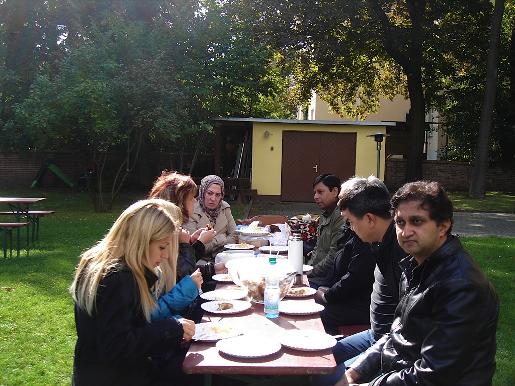 9月で語学学校のコースが終了しました。10月2日に同じクラスのメンバーと先生と一緒に学校にある庭で終了パーティーをしました。それぞれの国の料理を持ち寄ることになったので、私はちらし寿司ときんぴらごぼうを作って行きました。ベトナムの春巻き、シリアのケーキなどなど9カ国の料理を囲んで楽しい時間を過ごすことができました。コース当初よりみなさんとも会話ができるようになり、ドイツ語も少し上達したと感じました。